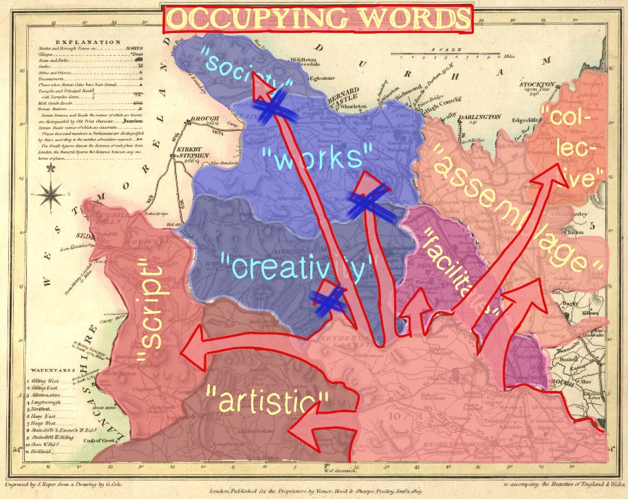 In Bruno Latours “Reassembling the social”, he writes about this three step process of deploying, stabilizing and composition. Read the quotation here. When talking about deploying, he refers to the action of taking into account all the actors that we need to include, in order to reassemble the social. This is kind of what I’m doing with the words that I collect for constructing this framework: I take existing words that I consider still necessary, while excluding other words, that are simply worn out – like ‘creativity’, ‘works’, etc – and then I’m inviting new words to the assemblage.