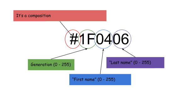 The first to ciphers represent the generation. First generation is ’00’. The compositions based on anything from a generation ads a number here, and becomes next generation. Second generation thus has ’01’ here. There are 256 possible numbers in 2 hexadecimals (16×16), and that makes up for quite a few ‘generations’. In each generation, further, there are 256 possible ‘members’. Hopefully 65.536 (256×256) possible improvisations is enough for my lifetime 🙂