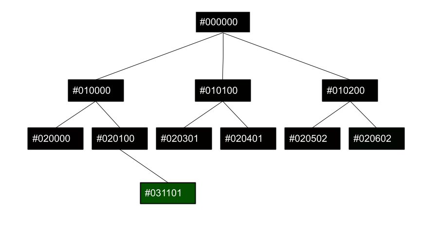Here, you see four ‘generations’ of improvisations, where three impros are derived from one ‘mother’ composition, and each of the three have two ‘offsprings’ each with their unique generational ‘first name’ (00 – 06). In the last row, “generation 03”, I have put an improvisation, which is supposed to be the hexadecimal 11th, ie 17th improvisation over the composition #020100.